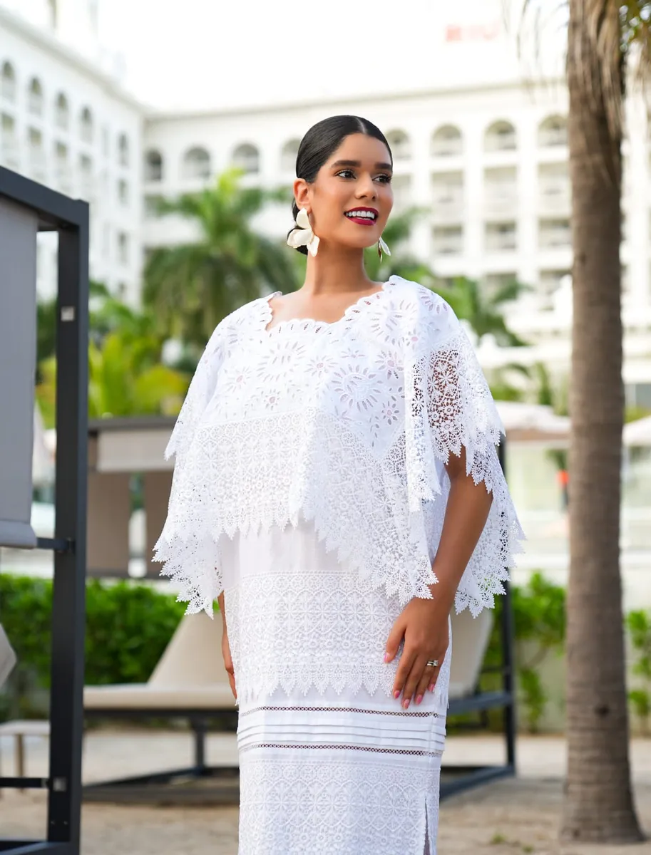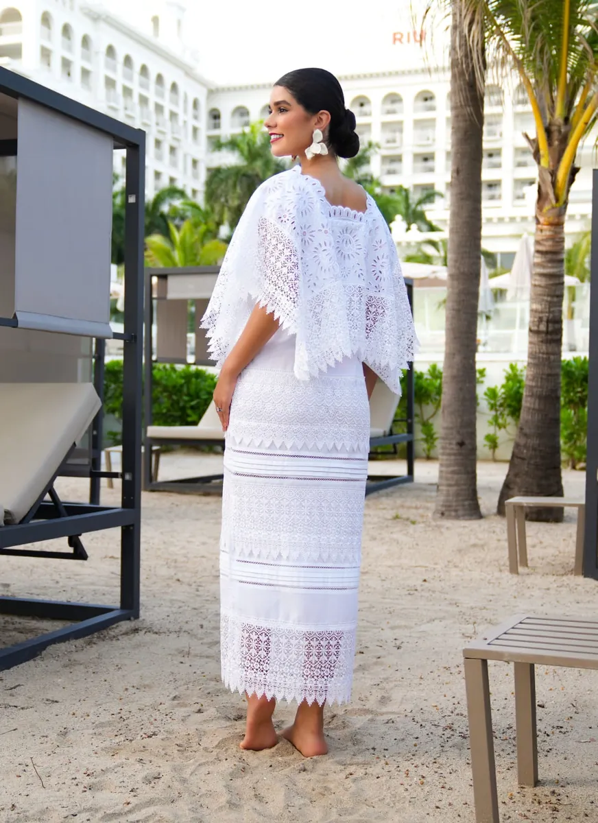 Fabricado en lino Flamé, Encaje Inglés y calado, no sólo es visualmente atractivo, sino también cómodo y ligero, perfecto para celebraciones como bodas, aniversarios y cumpleaños. Su largo favorecedor y los detalles bordados hacen de esta prenda una elección ideal para quienes buscan destacar en eventos especiales.